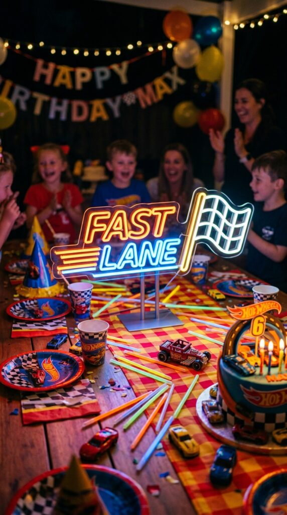 Grab a small “Fast Lane” or checkered flag neon sign and position it behind your centerpiece. The glow instantly sets a racing atmosphere.