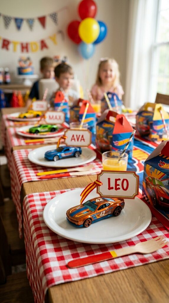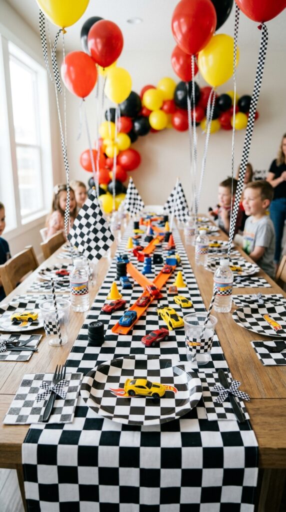 Add mini checkered flags alongside, and guests will feel like they’re sitting trackside at an actual race. Functional, affordable, and genuinely impressive. This approach works especially well when coordinating with Hot Wheels birthday decor themes that tie together the table, balloons, and overall party aesthetic.