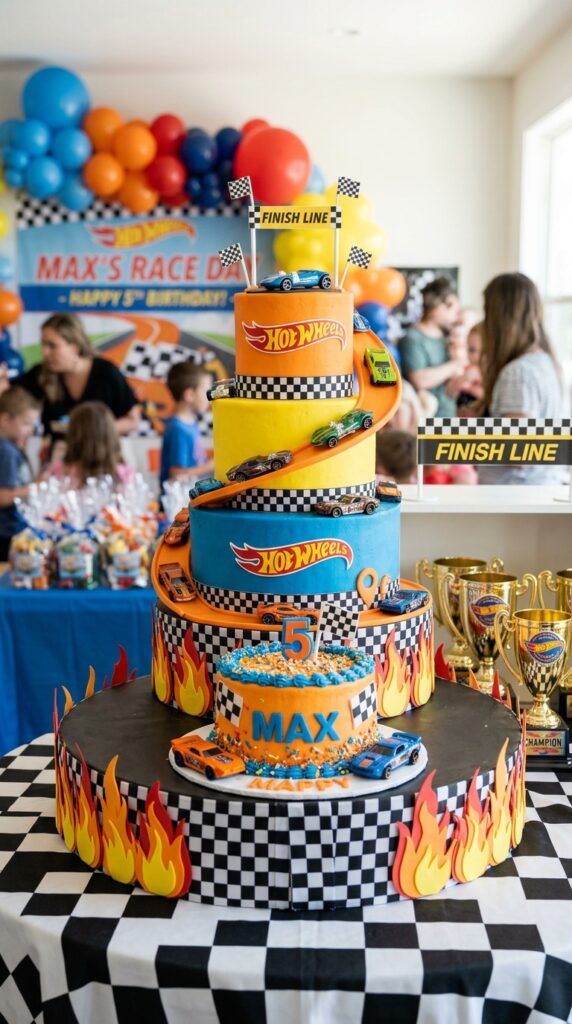 When it comes to party centerpieces, your cake display is the crown jewel — and a Hot Wheels theme gives you so much to work with. Stack tiered platforms at different heights and wrap each level with checkered ribbon.