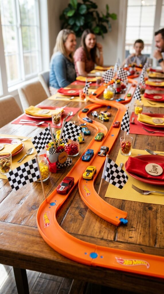 Kids absolutely love running their cars along the track while waiting for cake. It changes a functional surface into an interactive centerpiece that keeps little racers entertained throughout the entire party. Complete the look by placing toy cars and flags at the center of the table as a finishing decorative touch that ties the whole racing theme together.