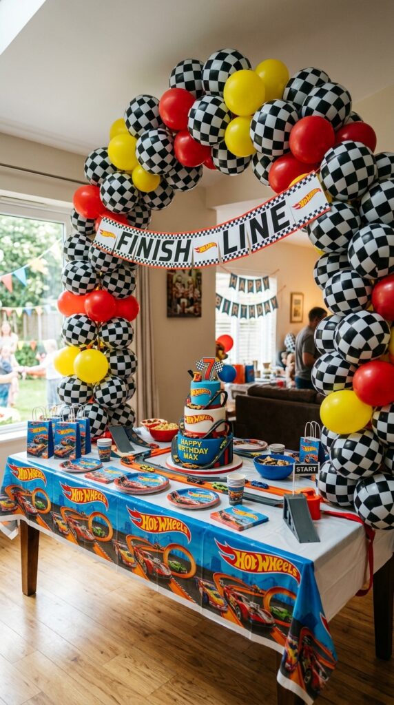 Add small red and yellow accent balloons throughout for that classic Hot Wheels color pop. Hang a “FINISH LINE” banner across the arch’s center, and suddenly your food table becomes the most dramatic spot in the room. When planning your arch height and balloon sizes, keep age-appropriate safety in mind since toddlers at the party may reach for low-hanging decorations.