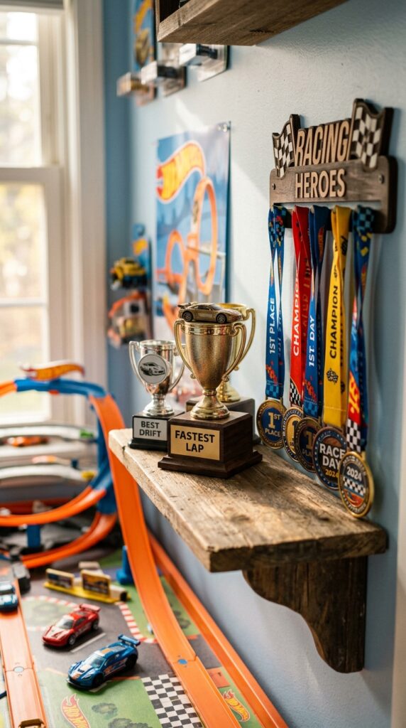 Add a medal rack beside it so kids can grab their prizes after friendly competitions. Label each prize with fun titles like “Fastest Lap” or “Best Drift.”