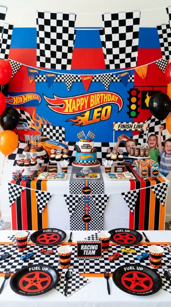 Fabric works great for indoor setups with good lighting. Both options print Hot Wheels graphics sharply, so you won’t sacrifice visual impact either way. Just match your choice to your venue and cleanup expectations. For a truly action-packed birthday celebration, pairing a bold vinyl backdrop with coordinating Hot Wheels party décor ties the whole theme together seamlessly.