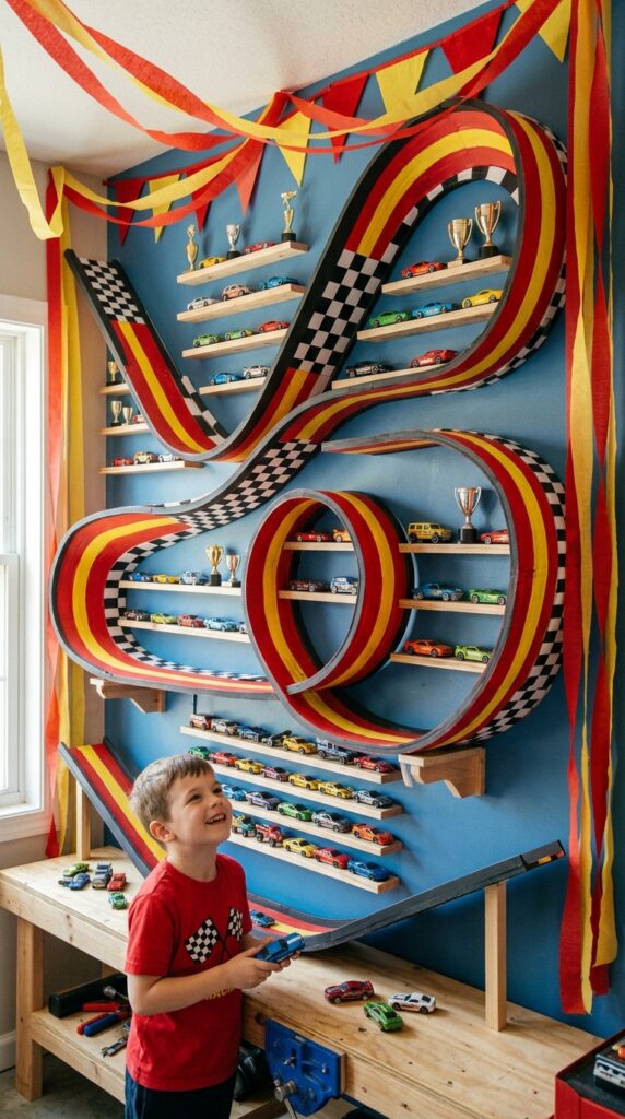 Create a designated pit stop zone using small shelves displaying die-cast cars and trophies. This adds incredible depth to your display.