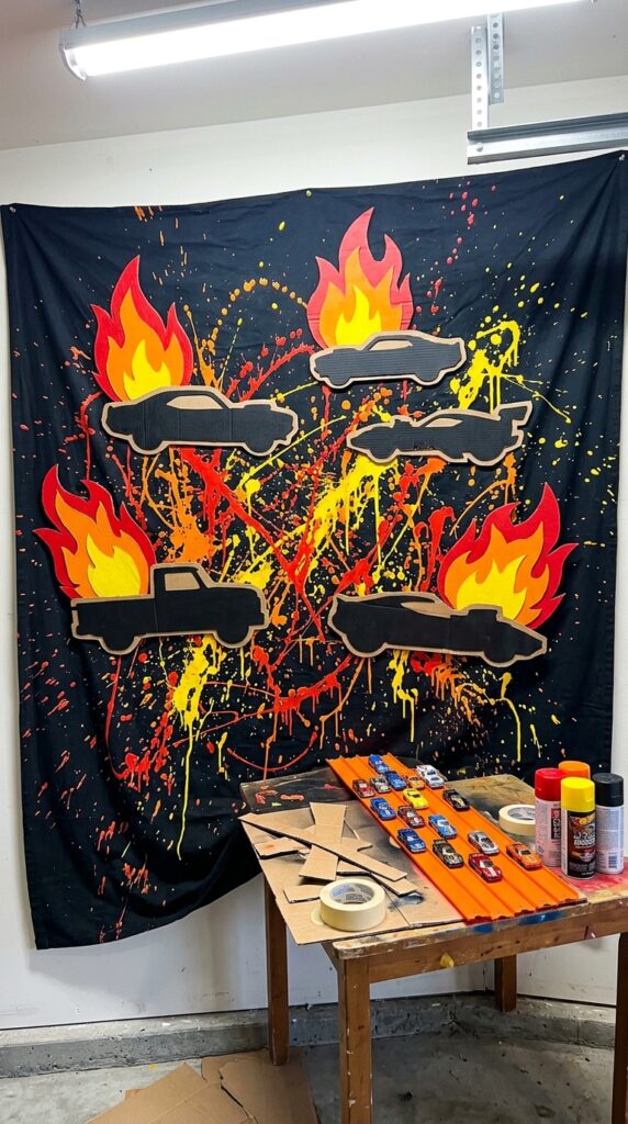 Grab large cardboard cutouts from your local craft store and trace iconic Hot Wheels flames and car silhouettes onto them.