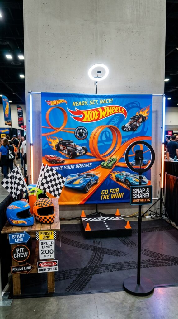 Add photo props like oversized checkered flags, foam racing helmets, and printed speed signs to encourage interaction.