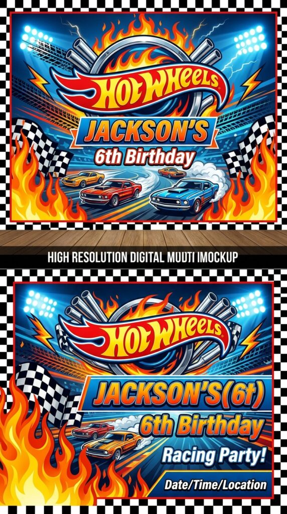 Look for high-resolution files that print cleanly on banner paper or foam board. Many sellers include editable text so you can personalize your child’s name right into the design. That personal touch genuinely enhances the whole setup. If you want to build even more excitement before the big day, pairing your backdrop with Hot Wheels party invitations that match the same racing aesthetic creates a cohesive look guests will notice from the start.