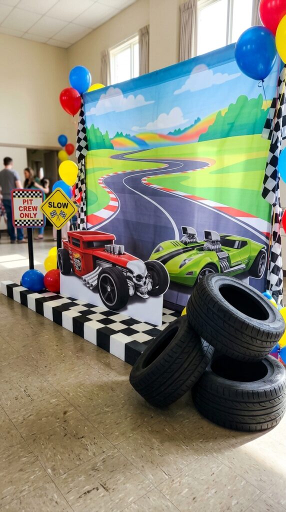 You can find pre-made options online or DIY one using black and white poster boards. Either way, this timeless design immediately signals “race day” to every guest who walks through the door. Complete the look by coordinating your backdrop with checkered table runners and tire-themed place settings to create a cohesive racing atmosphere throughout the party space.