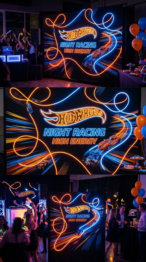 When the sun goes down, neon Hot Wheels backdrops completely convert a party space into something that feels electric — and I mean that almost literally.