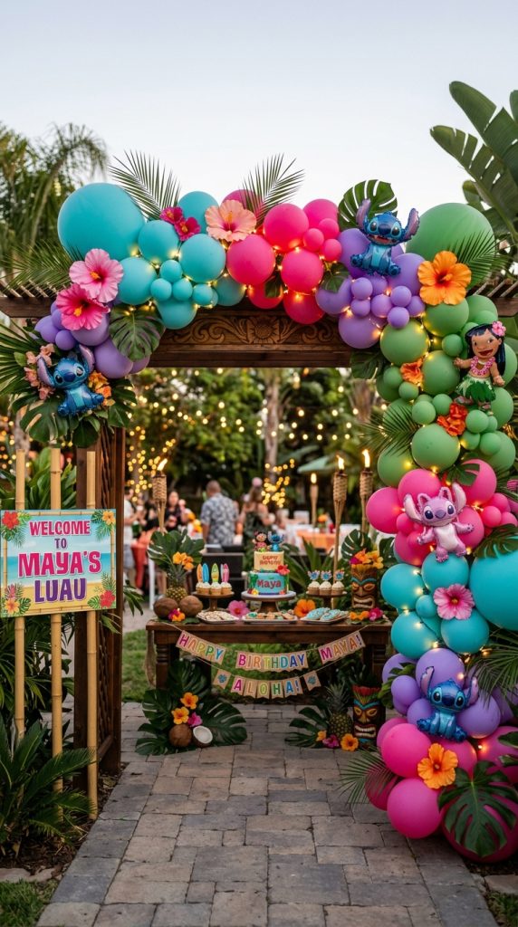A balloon arch is one of the easiest ways to instantly convert any space into a Lilo and Stitch wonderland. Use turquoise, pink, and purple balloons to match the Hawaiian theme perfectly.