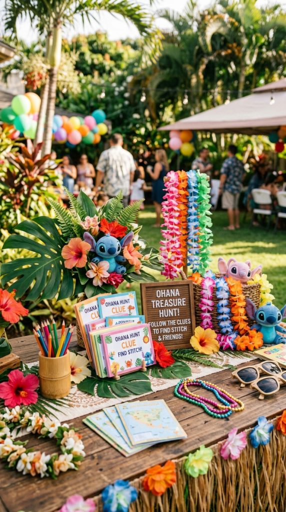 Set up a Stitch scavenger hunt around your backyard, hiding blue plush aliens and Hawaiian treats for kids to uncover. Trust me, even the adults will sneak a peek at the clue cards.