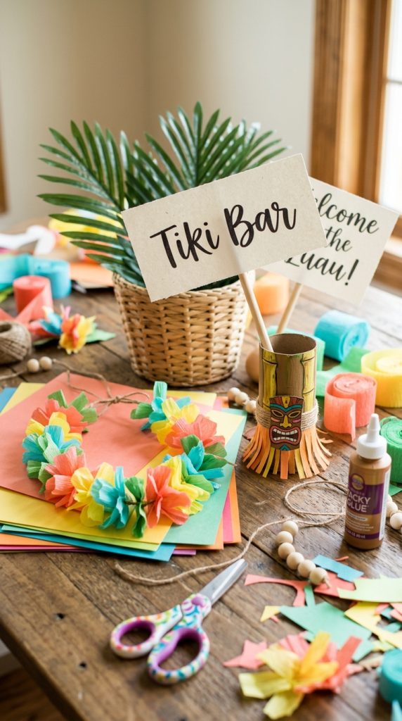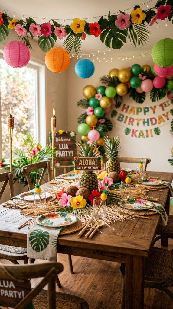 Hang colorful paper lanterns overhead to create a warm, festive glow that screams “aloha.” Add hibiscus flower garlands, palm leaves, and pineapple centerpieces throughout your space. Place grass skirts around table edges for extra tropical flair. For your food and drink display, a tropical table spread styled with layered island-themed elements ties the whole theme together beautifully.