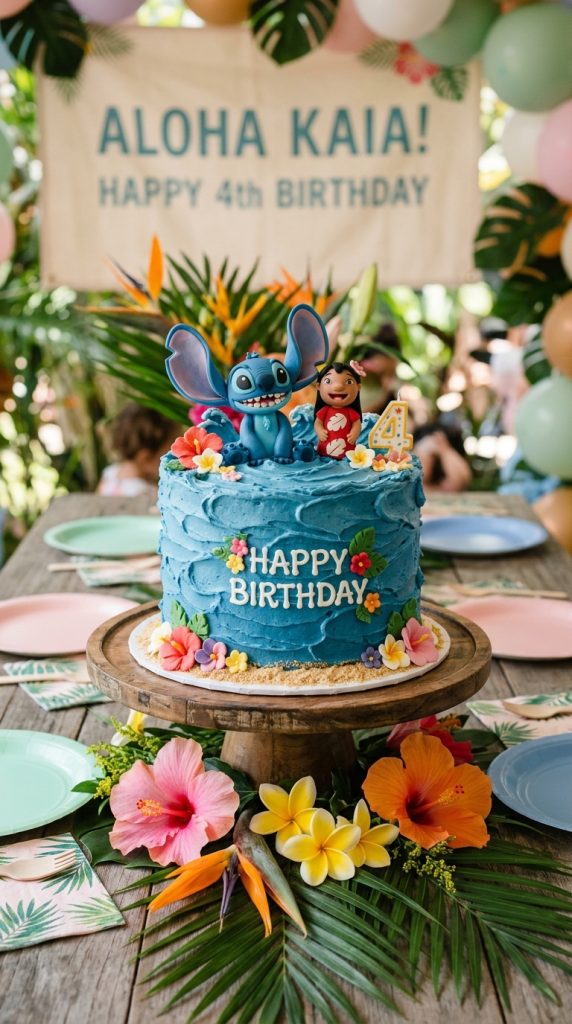Now here’s where the party really comes together — the cake. You’ve got two solid directions: a Stitch-shaped smash cake or a scene-style sheet cake. Both work beautifully for 5-year-olds.