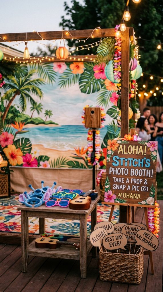 Don’t forget to style your nearby table with Lilo and Stitch centerpieces that tie the whole tropical theme together and give the photo booth area an extra pop of personality.