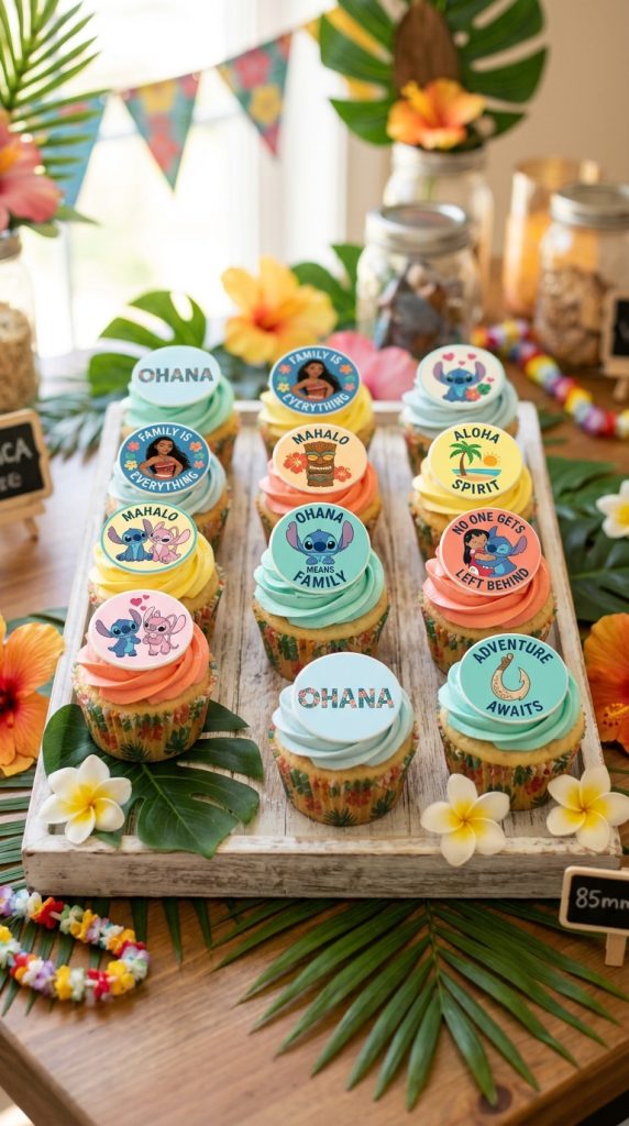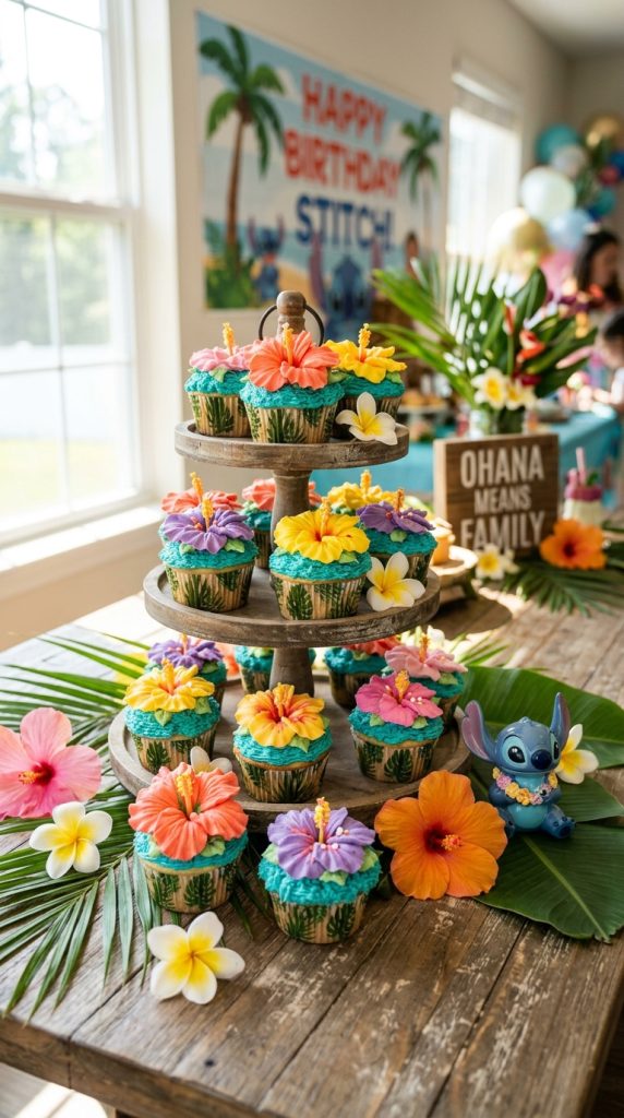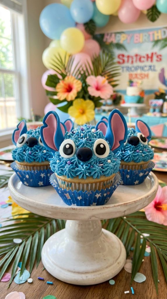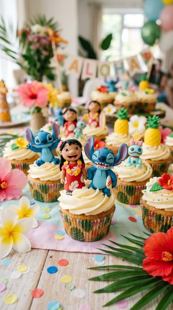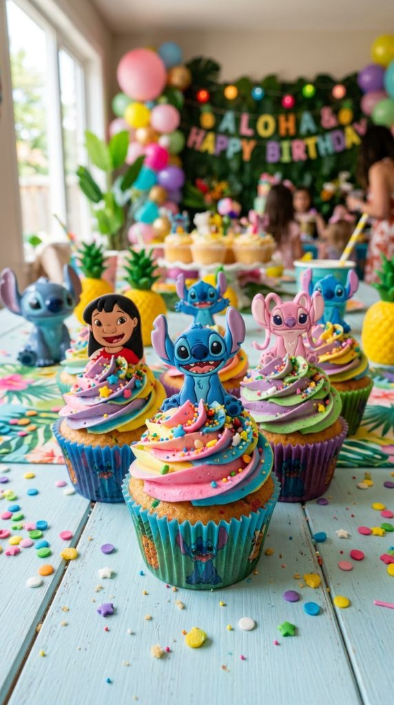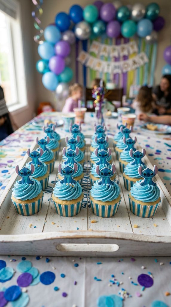 You can also package individual cupcakes as party favors for guests to take home — a sweet, edible reminder of a birthday celebration nobody will forget anytime soon. For a complete celebration, pairing these cupcakes with Lilo and Stitch decor tailored specifically for girls makes the party feel extra cohesive and magical.