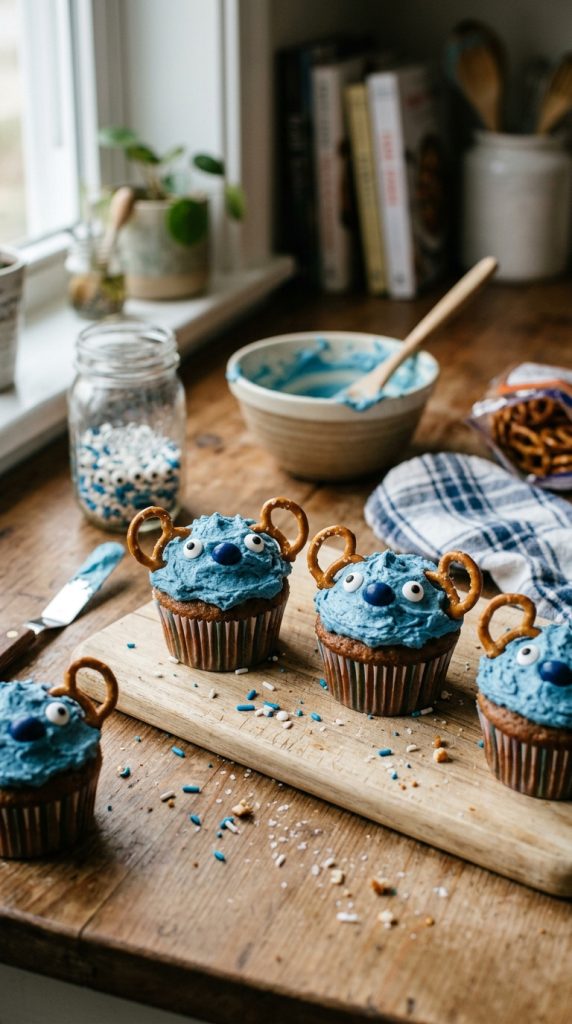 Stitch face cupcakes are the star of any Lilo and Stitch birthday spread, and they’re surprisingly fun to make. Start by piping blue swirls of buttercream onto each cupcake using a large star tip. The swirls create that fluffy, textured look that mimics Stitch’s fur perfectly.