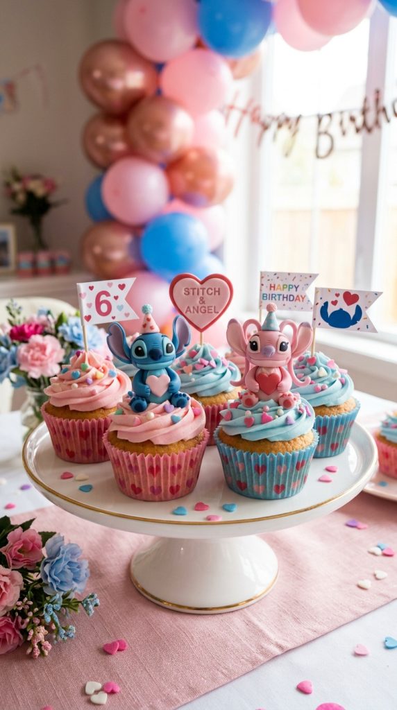 Few character pairings capture hearts quite like Angel and Stitch together, which makes them perfect for a Valentine-style birthday cupcake theme.