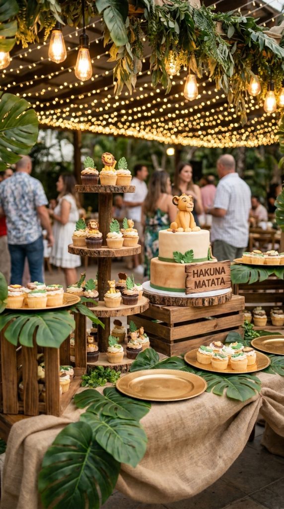 Layer your table with varying heights using cake stands and wooden crates. Then add personality through small details. Print out themed dessert labels for each treat — “Hakuna Matata Cupcakes” or “Timon’s Bugs” hits differently than a plain tag. Trust me.