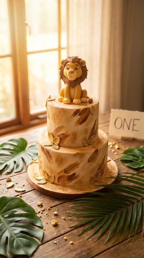 Your little one’s first birthday deserves a showstopper cake—and Lion King themes give you so many stunning directions to go. Consider a tiered cake featuring Simba on Royalty Rock, surrounded by savanna-colored fondant in those warm golds and earthy browns we discussed earlier.