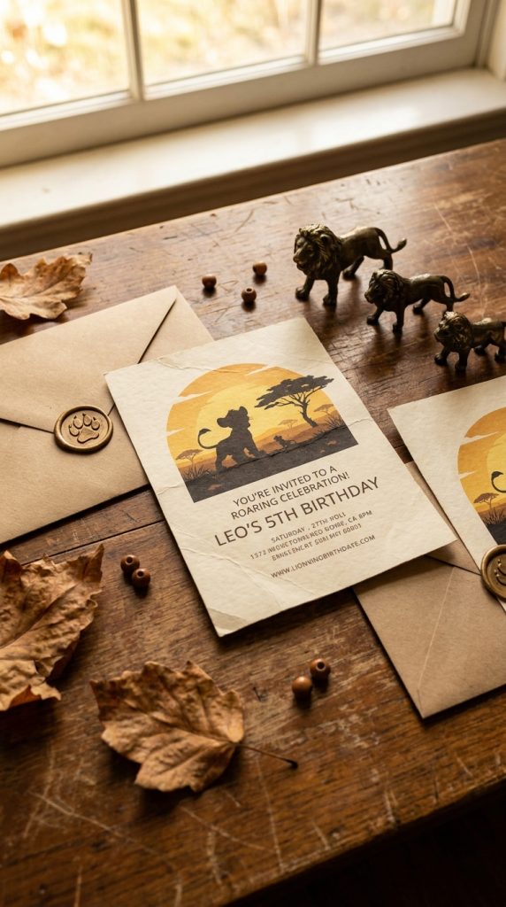 Your invitation design should immediately scream “The Circle of Life.” Think golden sunsets, herd Rock silhouettes, and baby Simba imagery. Etsy sellers like PaperAndThyme offer stunning customizable Lion King designs that print beautifully at home.