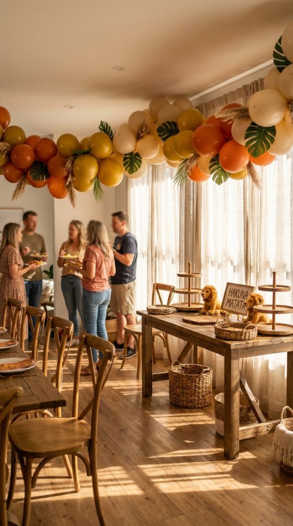Layer in animal prints through tablecloths, balloon patterns, and banner accents. Zebra stripes and leopard spots work beautifully alongside Simba’s golden color palette. Don’t forget vertical space—hang Simba and Rafiki cutouts at varying heights to draw the eye upward.