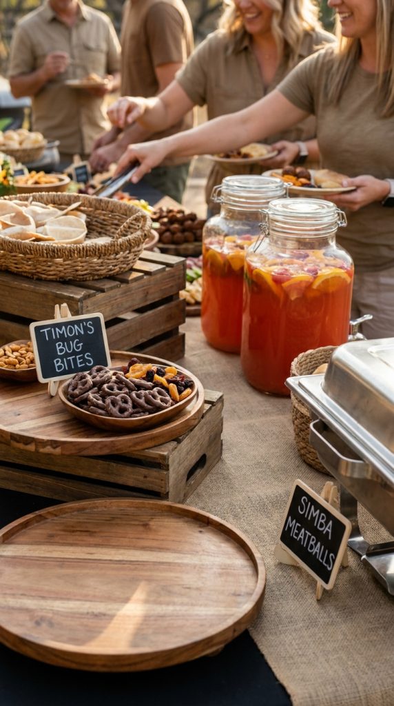 Round out your spread with “Timon’s Bug Bites” (chocolate-covered raisins), “Simba’s Meatballs,” and “Savanna Sandwiches” cut into lion-shaped pieces. Simple labels convert ordinary food into memorable, on-theme bites your guests will love.