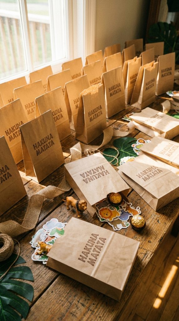 Instead, pack small goodie bags with Lion King toys like mini figurines or finger puppets — kids genuinely play with these. Toss in some jungle stickers, which are perfect for little hands and cost almost nothing in bulk.