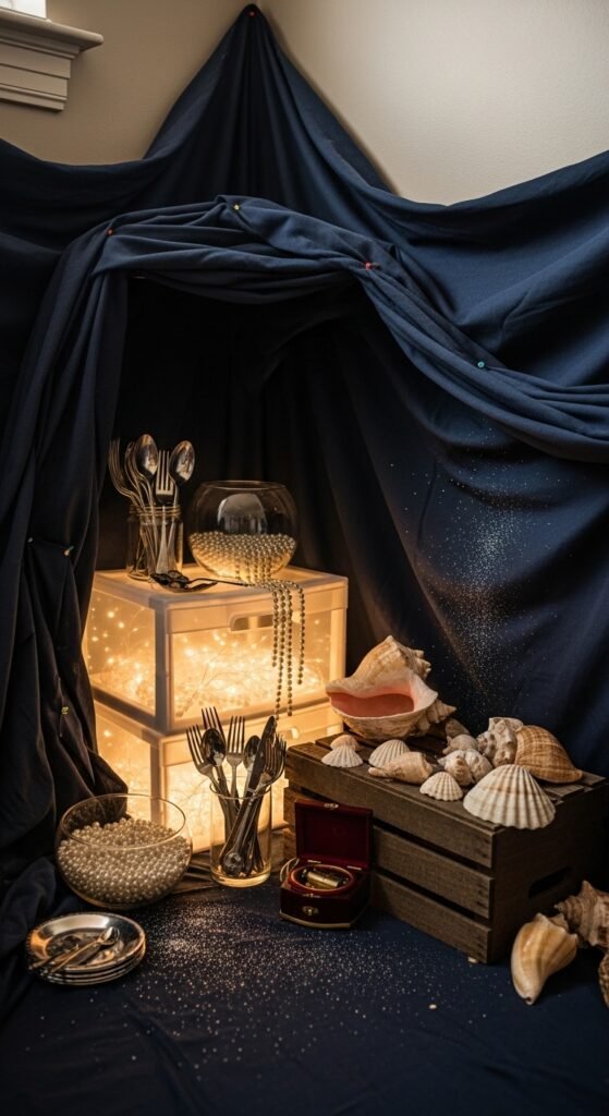 Fill the space with “treasures” – plastic jewelry, old silverware, music boxes, and vintage trinkets from thrift stores. Create a stunning seashell collection display using bowls at different heights. Add battery-operated string lights behind translucent containers for that magical underwater glow.