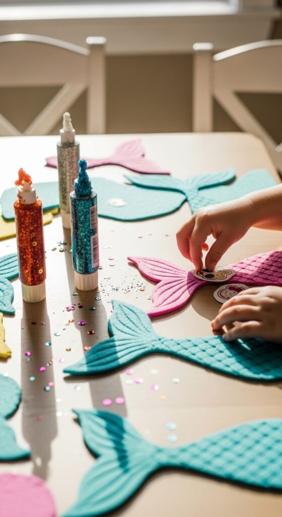 Set up a crafting station with colorful fabric pieces, sequins, and glitter glue. I’ve found that pre-cut tail shapes save time and reduce mess. Let kids decorate with seashells you’ve collected beforehand—they’ll love the authentic ocean touch.