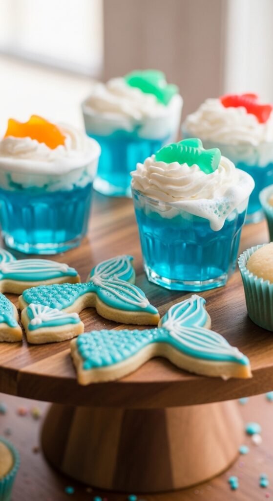Start with mermaid shaped desserts like tail-shaped sugar cookies decorated in shimmering blues and greens. I’ve found that edible glitter converts ordinary treats into underwater treasures.