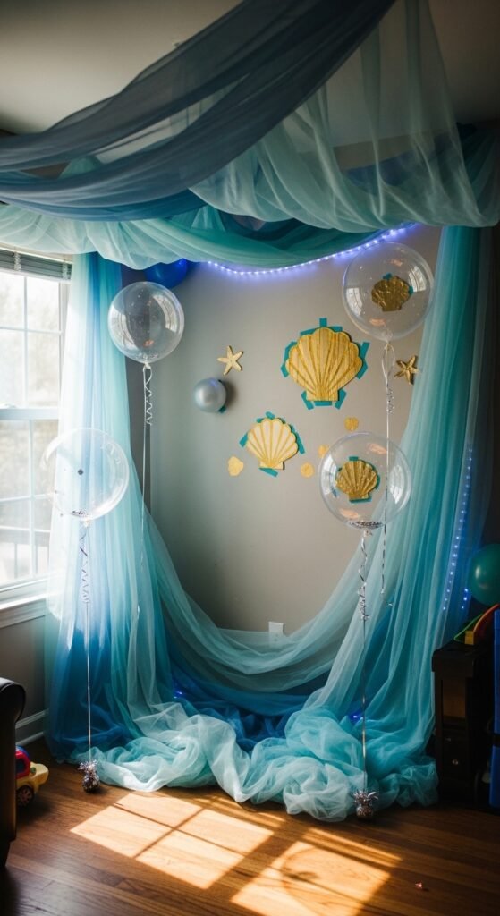 Transform backdrop with underwater scene using blue streamers, iridescent fabric, or a printed ocean backdrop. I’ve found that hanging jellyfish made from clear umbrellas and ribbons creates stunning depth.