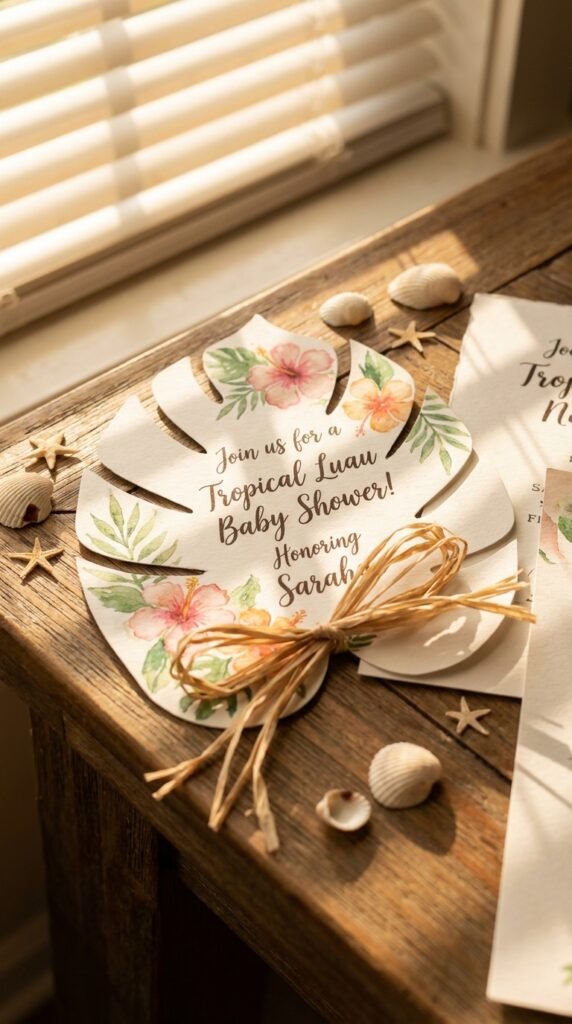 Add phrases like “Baby [Name] is sailing our way” or “Join us for a tropical celebration.” Include small details like raffia ribbons or mini shells to complete the island vibe.