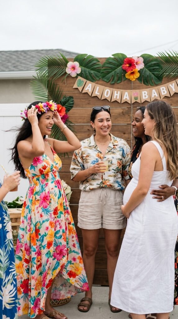 Since your luau baby shower should feel like a mini vacation, setting the right dress code helps guests welcome the tropical spirit from the moment they arrive.