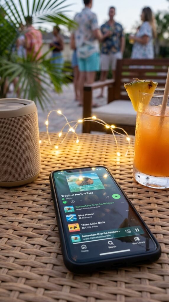 Smart music genre selection includes reggae hits from Bob Marley, steel drum instrumentals, and contemporary island-inspired tracks. Mix upbeat songs for mingling with mellower tunes during gift-opening. Don’t forget surf rock classics—they bridge vintage and modern flawlessly. Create seamless shifts between artists to maintain that laid-back island vibe throughout your celebration.