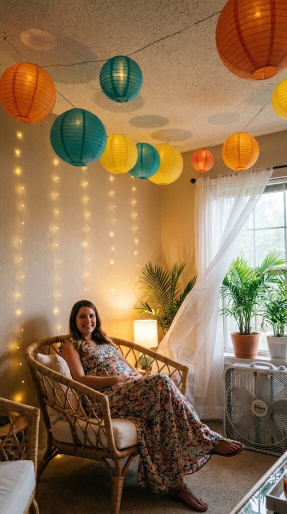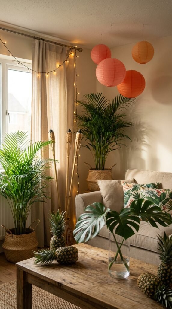 Hang paper lanterns in sunset colors—coral, orange, and yellow—to complete your island alteration.