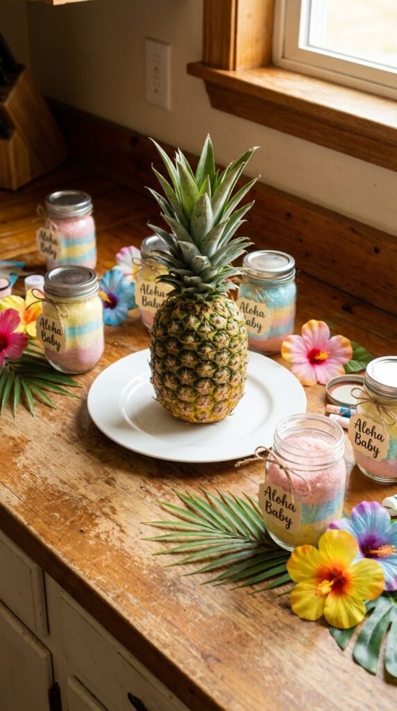 For budget friendly party favors, fill small mason jars with tropical candy or make mini sand bottles using colored salt. Print your own “Aloha Baby” labels at home. Even grocery store pineapples become magnificent centerpieces when paired with simple candles.