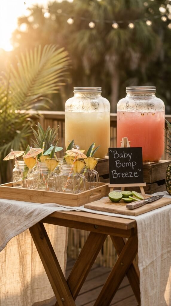 Give your drinks creative cocktail names like “Baby Bump Breeze” or “Mama’s Mango Madness.” Trust me, guests love ordering something with personality. Include fun recipe cards so everyone can recreate the magic at home.