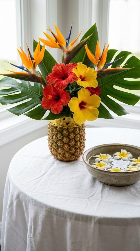 Don’t forget pineapples! They’re perfect natural vases when hollowed out, adding both tropical charm and functional beauty to your centerpiece display.