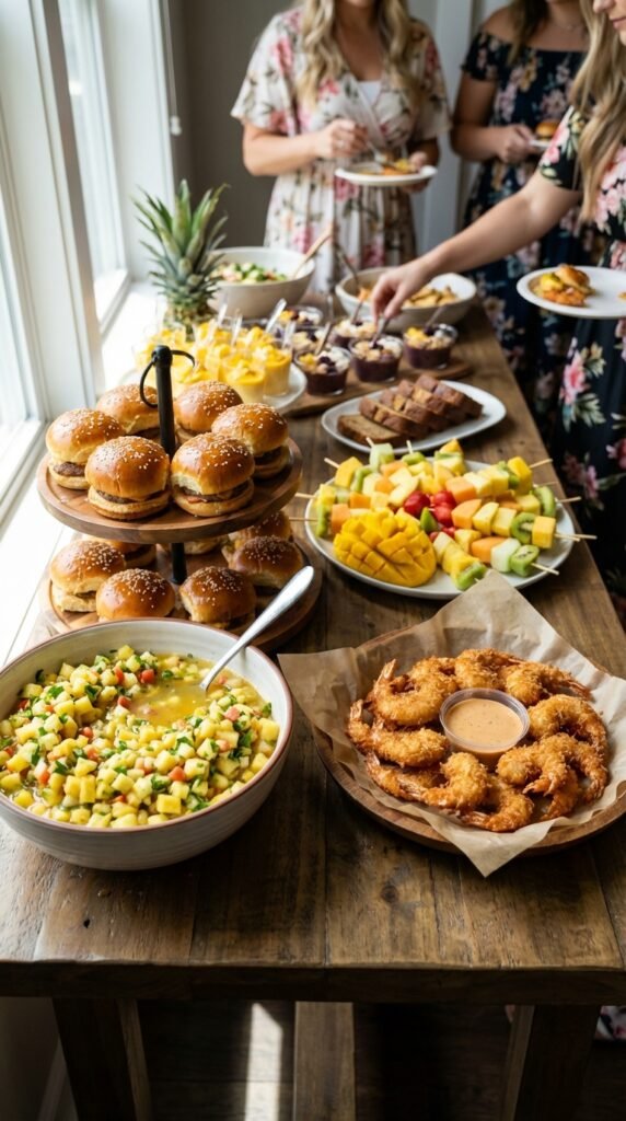 Start with island inspired appetizers like coconut shrimp, pineapple salsa with tortilla chips, and Hawaiian sliders with teriyaki sauce. They’re crowd-pleasers that scream tropical paradise.