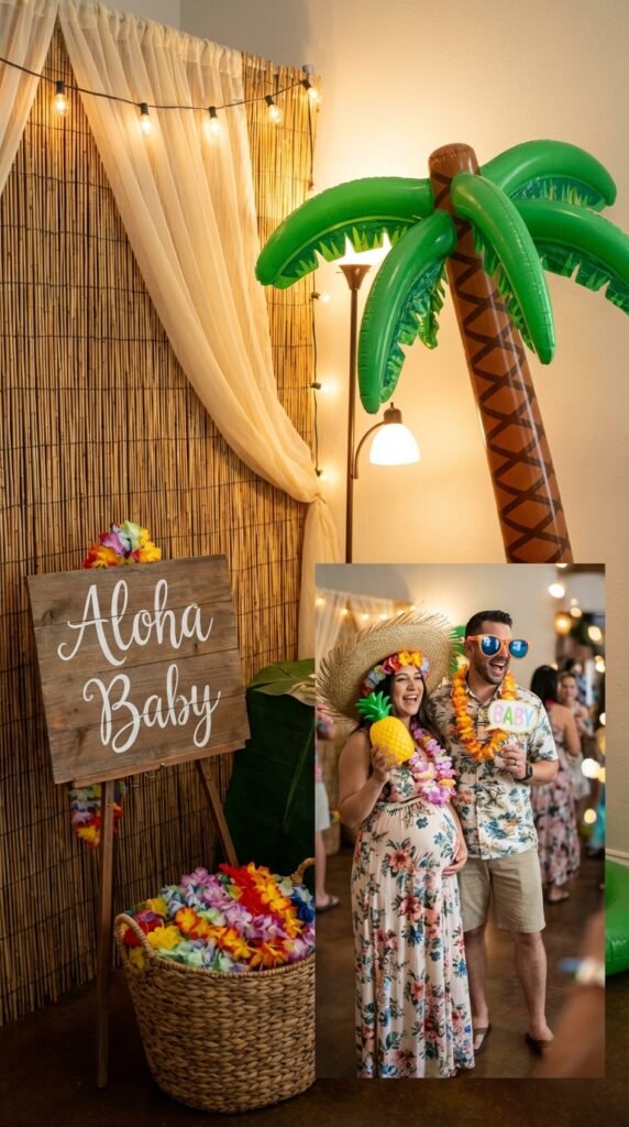 Stock your station with tropical photo props like oversized sunglasses, flower crowns, pineapple cutouts, and “Aloha Baby” signs. Don’t forget inflatable palm trees, grass skirts, and colorful leis for maximum fun. Position everything at eye level on a decorated table.