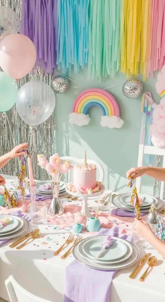 I’ve found that iridescent elements work beautifully—think holographic balloons and shimmering backdrops that catch the light. Don’t forget rainbow hues for that unicorn magic! Incorporate these colors through tablecloths, streamers, and party favors.