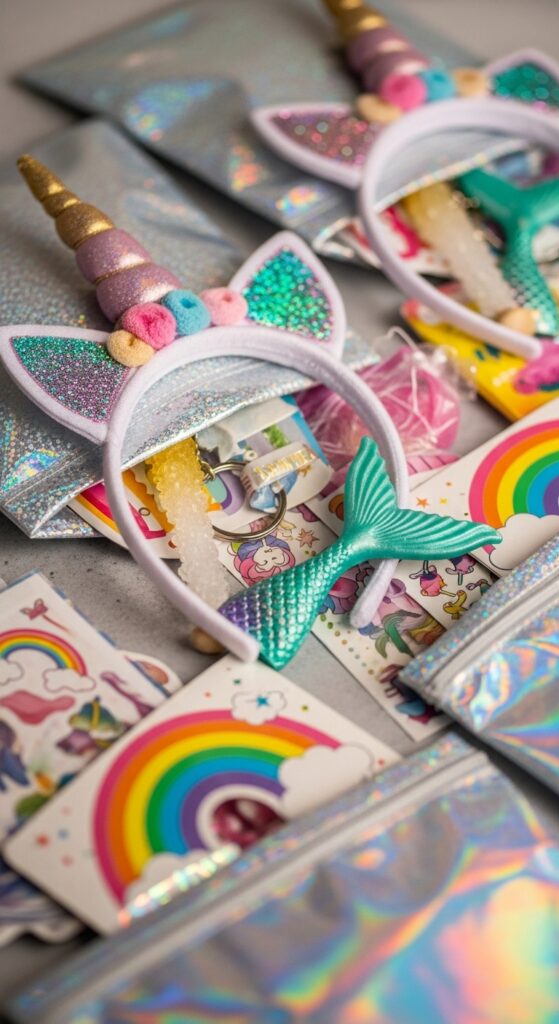 For themed goodie bags, choose shimmery pouches in pastels or holographic materials. Fill them with temporary tattoos, rainbow stickers, and small toys like plastic seahorses or unicorn figurines. I always include a sweet treat too – maybe rock candy “gems” or cotton candy that looks like unicorn hair. These thoughtful touches create lasting memories.