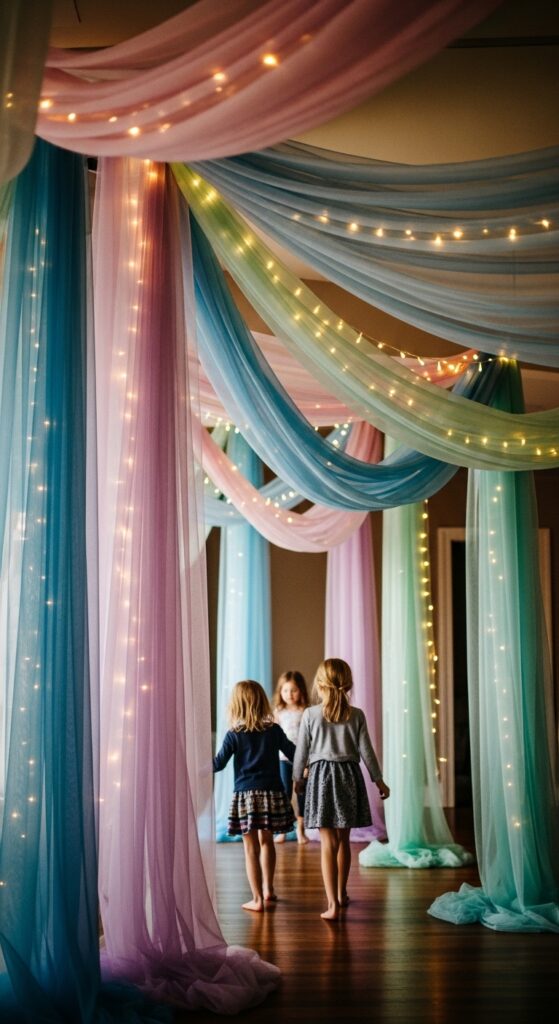 Start with cascading fabric canopies using sheer tulle in ocean blues and seafoam greens for mermaid vibes, or pastel purples and pinks for unicorn magic. Drape fabric from ceiling corners to create flowing waves overhead.