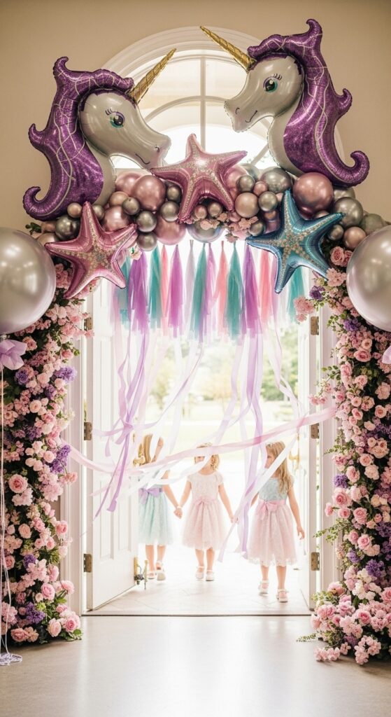 For the underwater theme portion of your entrance, consider incorporating DIY mermaid decorations that complement the balloon arrangements and enhance the overall fantasy atmosphere.