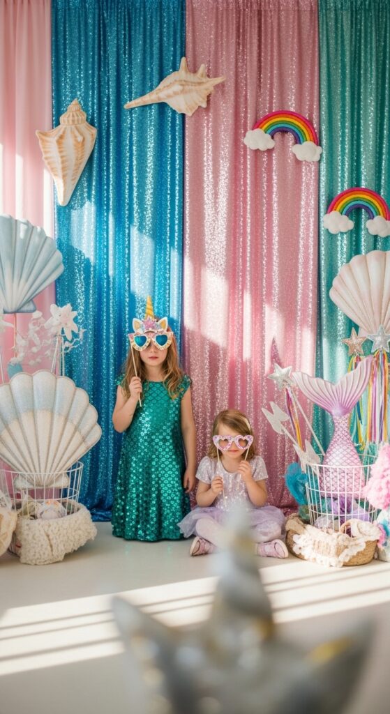 Set up enchanted backdrops using shimmery fabric panels in ocean blues and cotton candy pinks. Add fanciful props like oversized seashells, glittery unicorn horns, mermaid tails, and rainbow wands.