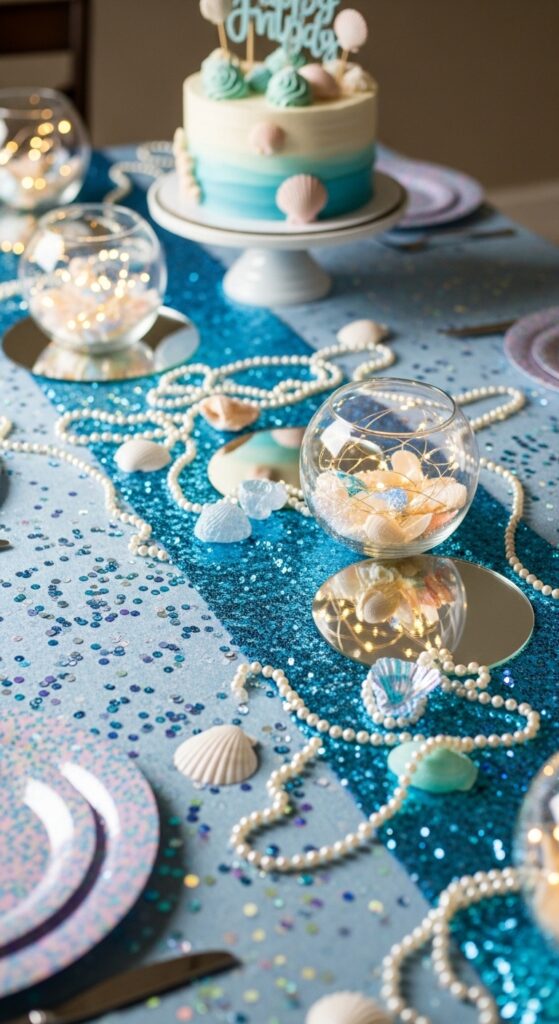 Your table decorations will absolutely steal the show when you layer on sequins and pearls like you’re decorating for underwater royalty. Start with shimmering tablecloths in iridescent blues and purples—they’ll catch the light beautifully. I’ve found that sprinkling loose sequins across the surface creates instant magic without breaking the bank.
