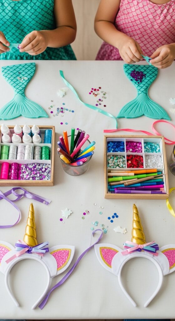 When it comes to keeping little hands busy and creating magical keepsakes, craft stations are absolutely essential for any successful mermaid and unicorn party. Set up two dedicated tables with all supplies organized in colorful containers.