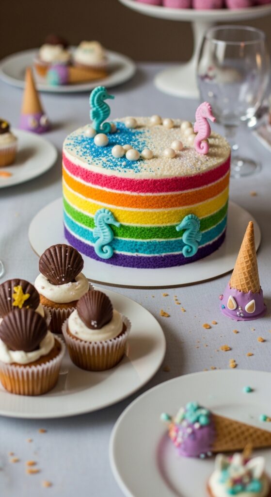 Consider unique toppings for the cake like edible glitter, pearl candies, and fondant seahorses. I’ve found that gel food coloring creates more vivid hues than liquid versions. Add “mermaid scales” using overlapping blue and teal frosting rosettes for that authentic underwater magic. Complete the ocean theme with mermaid-inspired cupcakes topped with chocolate seashells and edible glitter for an enchanting dessert display.