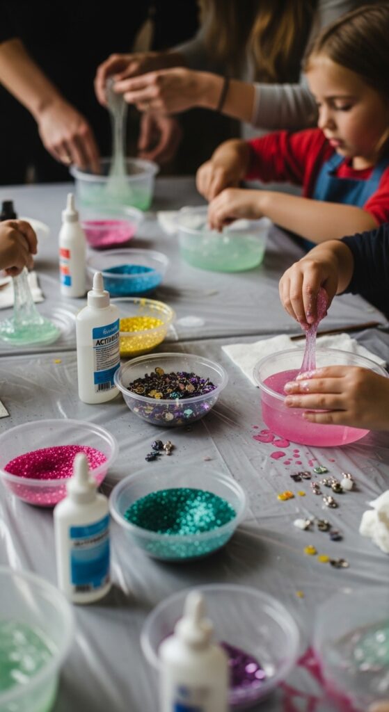 I’ve found that providing clear glue, activator, and an array of add-ins works best. Create glittery rainbow slime by offering different colored glitters in small bowls. Add essential oils for scented slime with charms—lavender and vanilla work wonderfully.