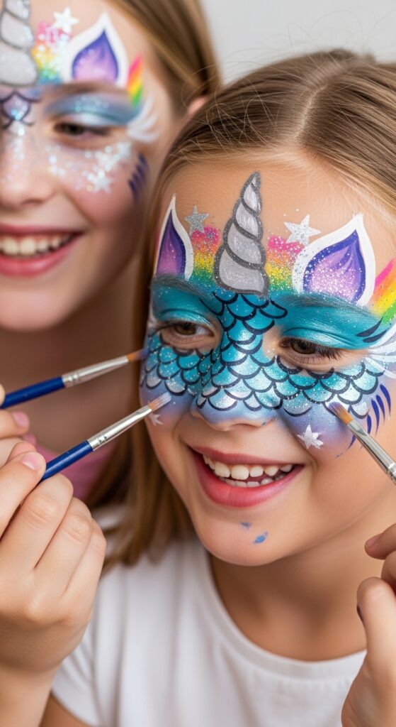 When you’re ready to alter little faces into magical creatures, face painting becomes the ultimate party highlight that’ll have kids squealing with delight. Set up your station with quality water-based paints in blues, purples, and metallics. You’ll want fine brushes for delicate scales and sponges for blending colors seamlessly.
